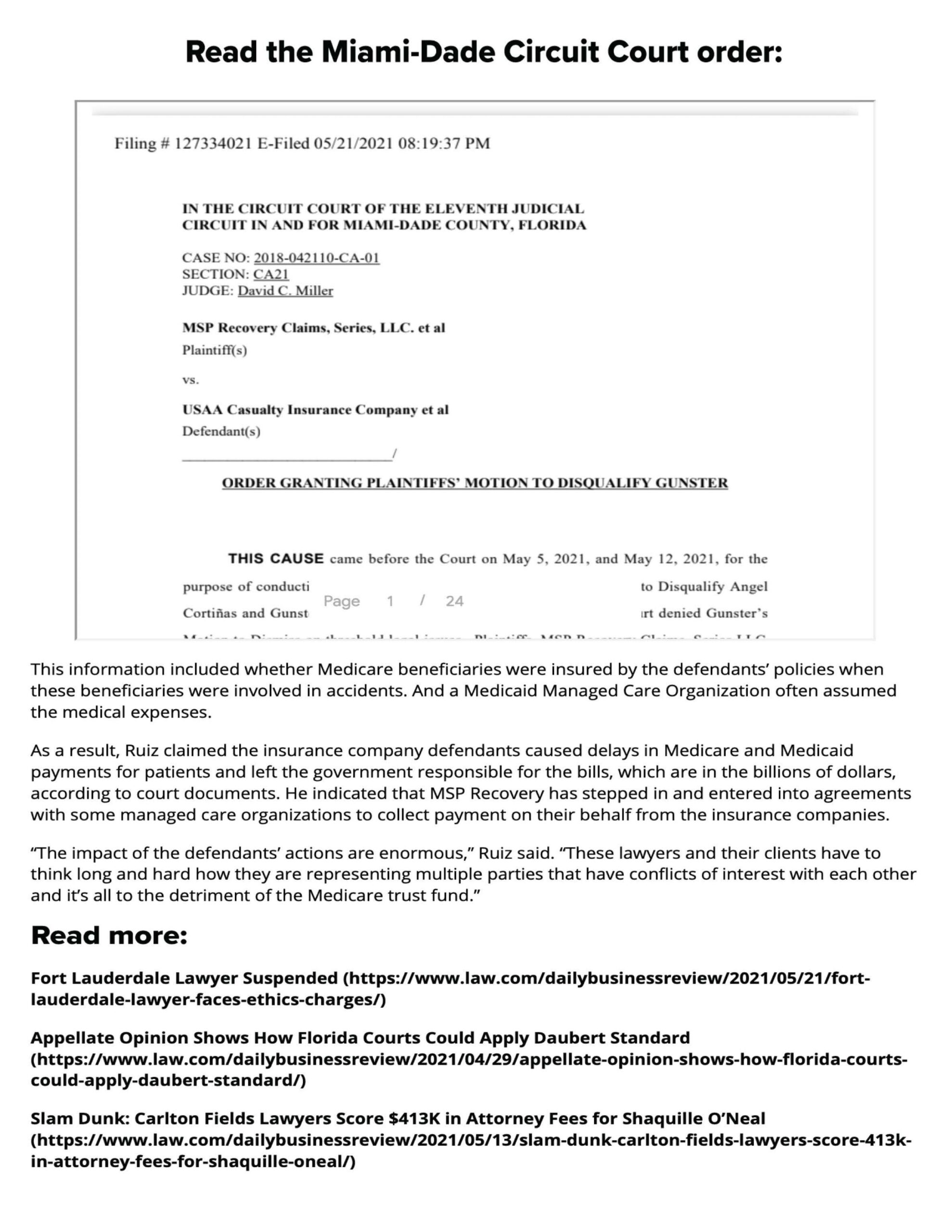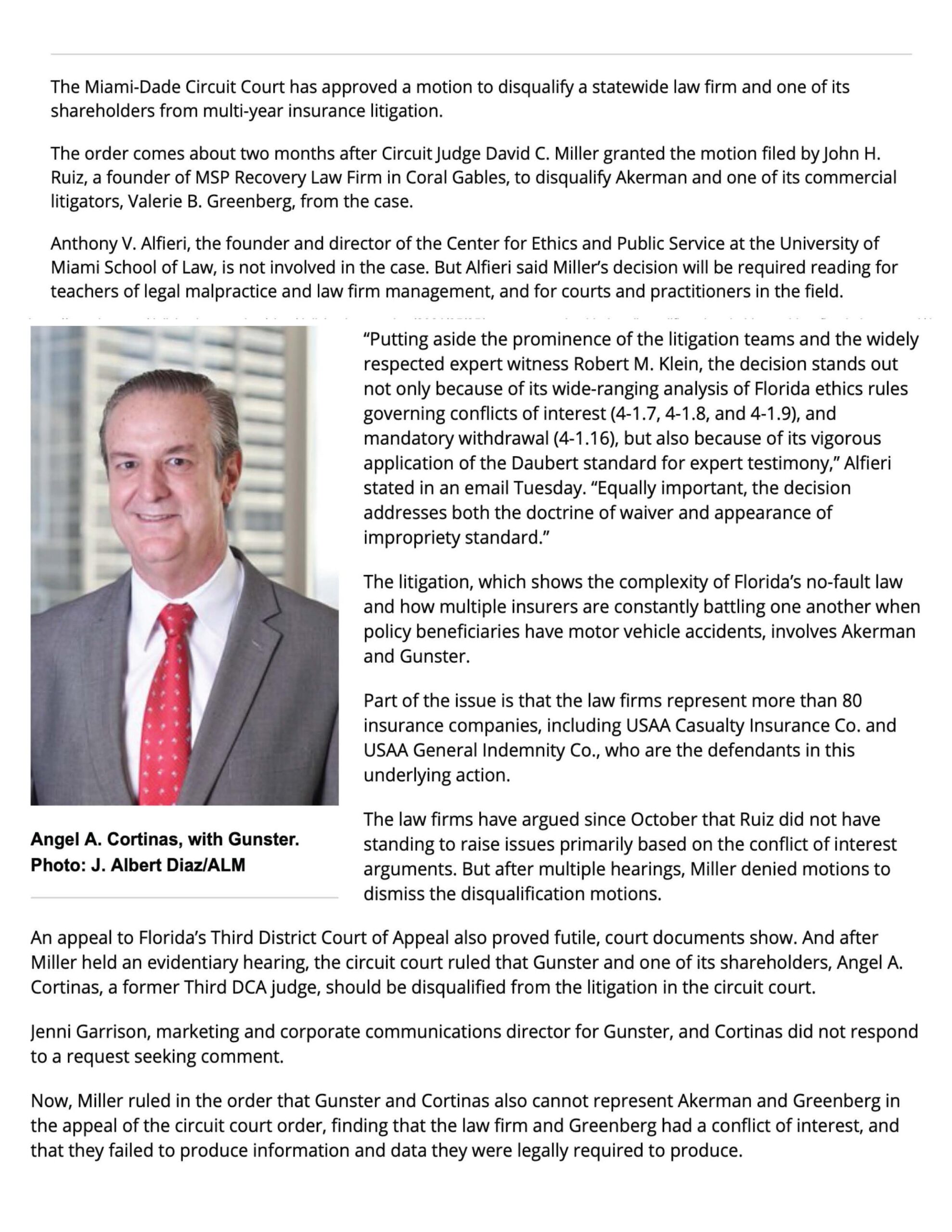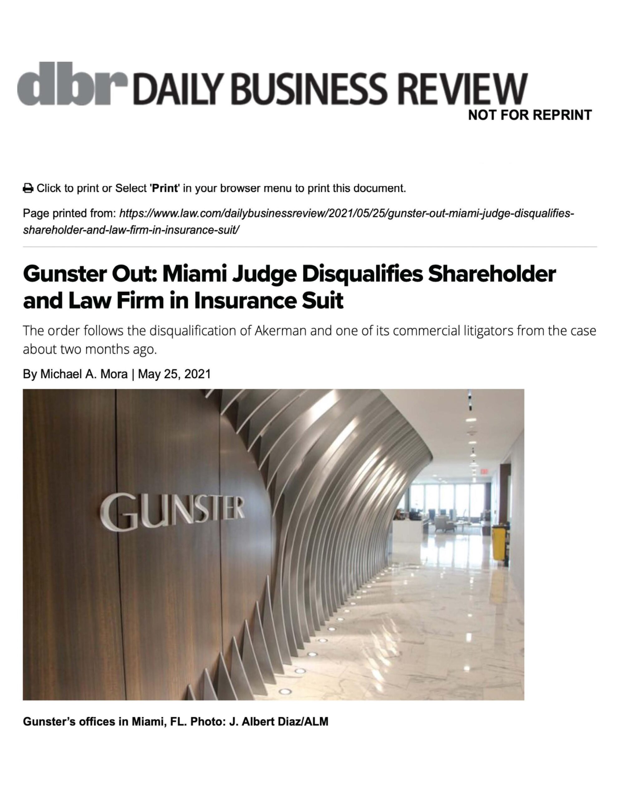 Gunster Out: Miami Judge Disqualifies Shareholder and Law Firm in Insurance Suit