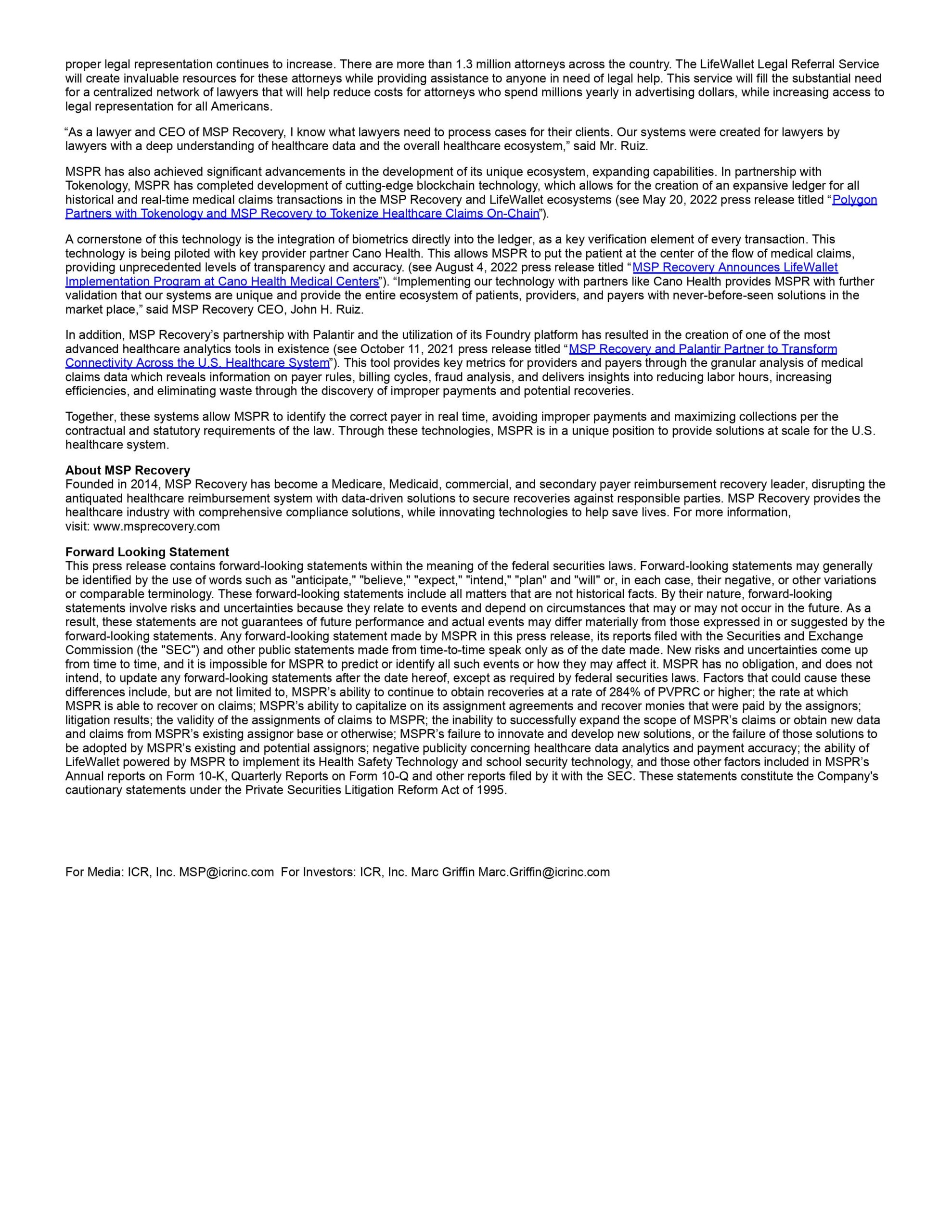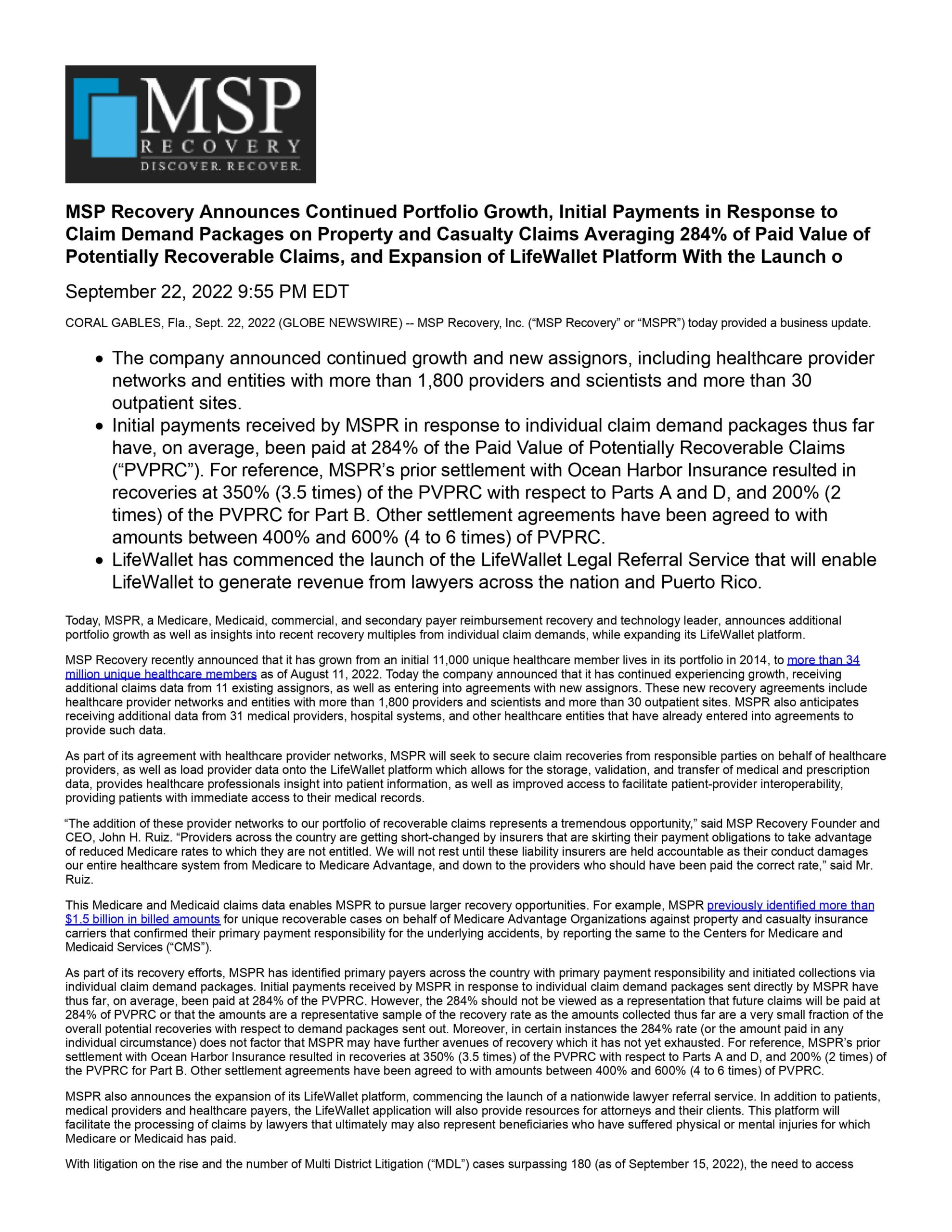 MSP Recovery Announces Continued Portfolio Growth, Initial Payments in Response to Claim Demand Packages on Property and Casualty Claims Averaging 284% of Paid Value of Potentially Recoverable Claims, and Expansion of LifeWallet Platform With the Launch o