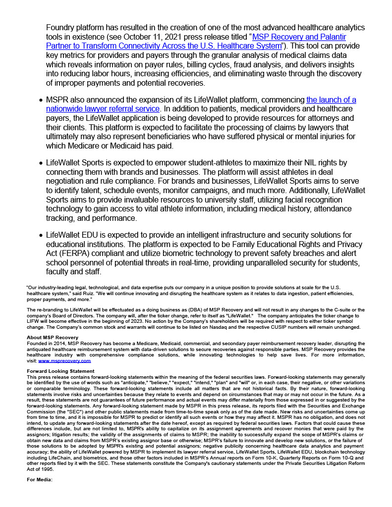 MSP RECOVERY ANNOUNCES IT WILL BE REBRANDING FROM MSP RECOVERY TO ITS NATIONALLY RECOGNIZED BRAND, “LIFEWALLET”
