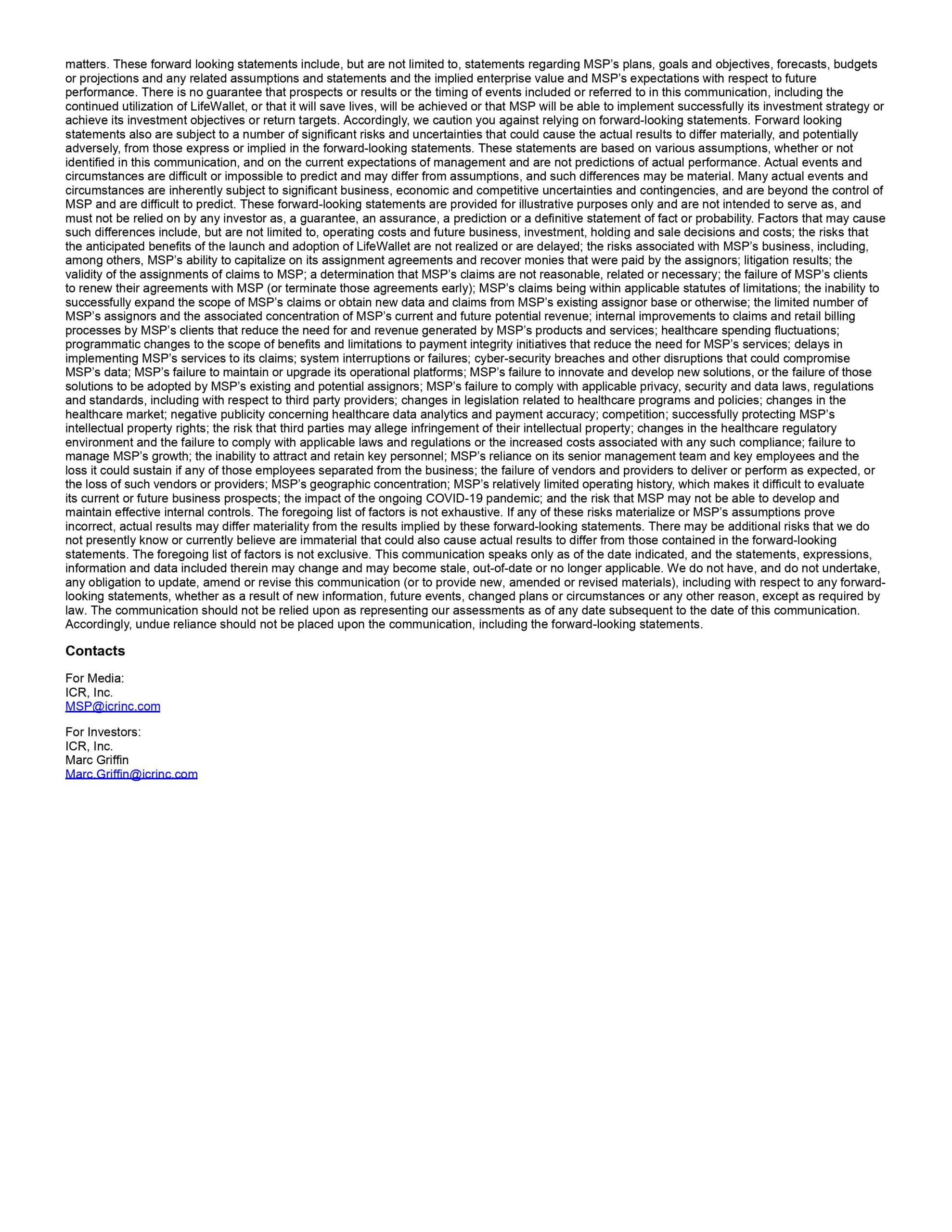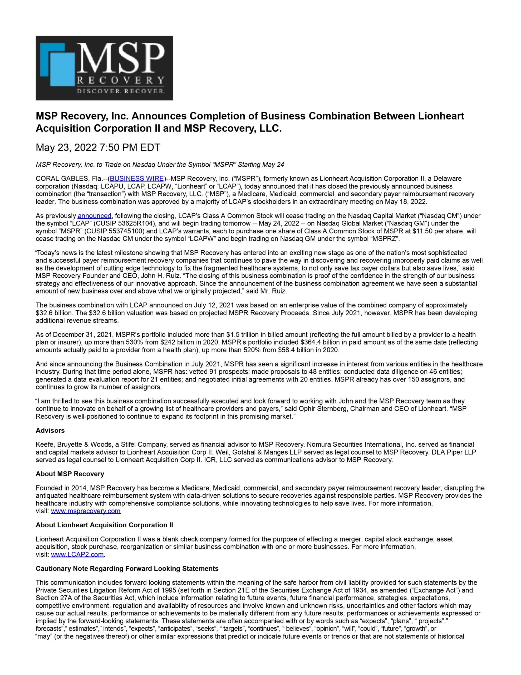MSP RECOVERY, INC. ANNOUNCES COMPLETION OF BUSINESS COMBINATION BETWEEN LIONHEART ACQUISITION CORPORATION II AND MSP RECOVERY, LLC.