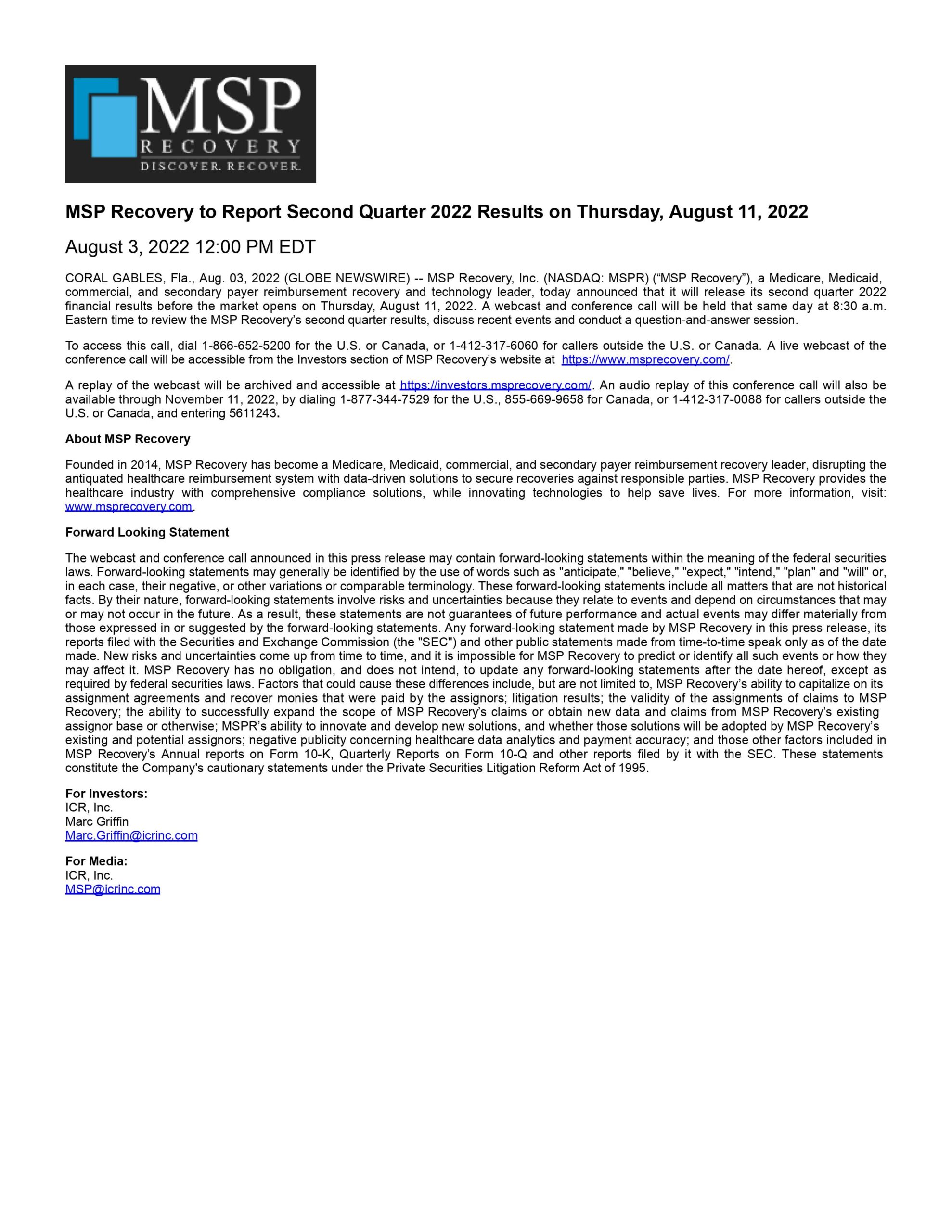 MSP RECOVERY TO REPORT SECOND QUARTER 2022 RESULTS ON THURSDAY, AUGUST 11, 2022