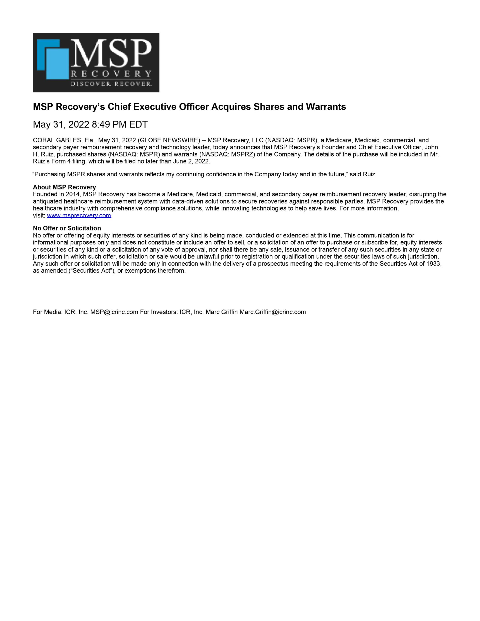 MSP RECOVERY’S CHIEF EXECUTIVE OFFICER ACQUIRES SHARES AND WARRANTS