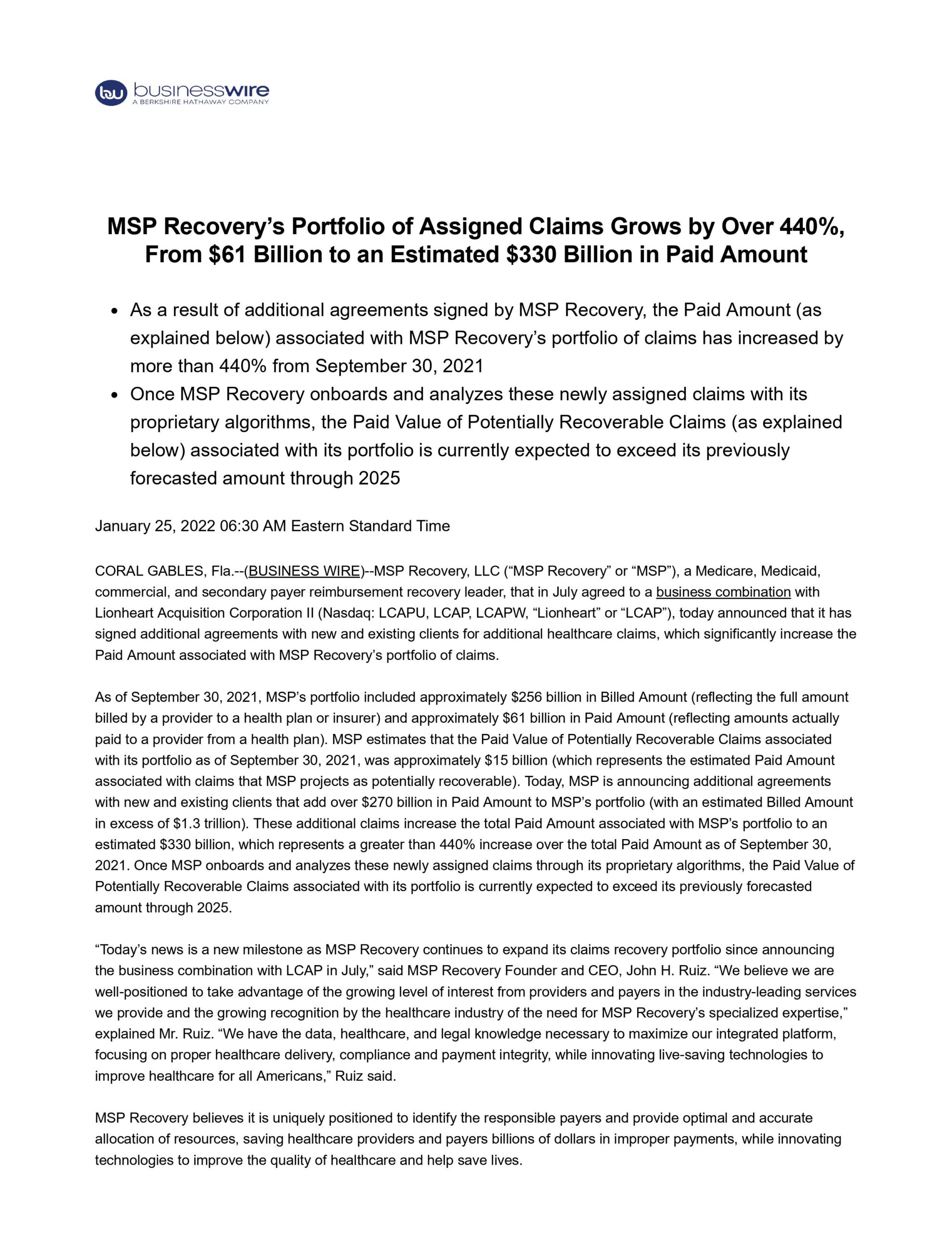 MSP Recovery’s Portfolio of Assigned Claims Grows by Over 440%, From $61 Billion to an Estimated $330 Billion in Paid Amount